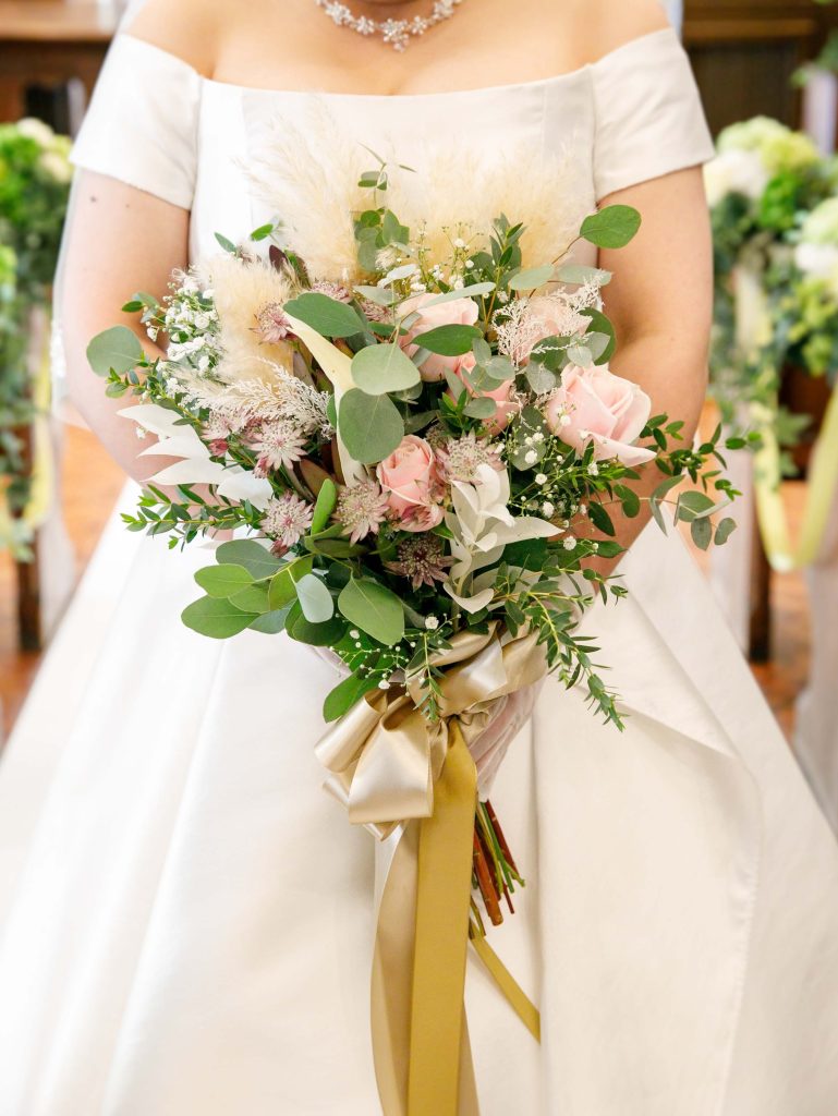 そこにふさふさしたパンパスグラスと、小さなカスミソウ、ゴールドのリボンが冬のイメージにぴったりですね✨